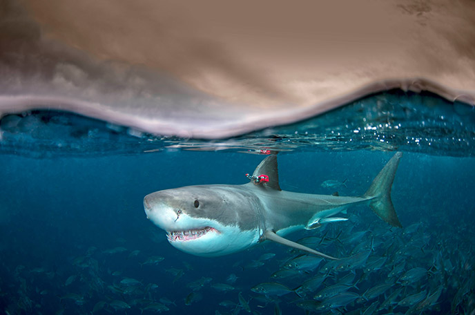 図1:バイオロギング機器を取り付けたホホジロザメ(撮影:Andrew Fox)