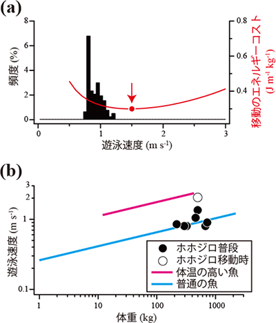 (a)ホホジロザメ一個体の遊泳速度の頻度分布および移動のエネルギーコストの推定値。移動に最適な速度(矢印)よりも遅い速度で泳いだことがわかる。