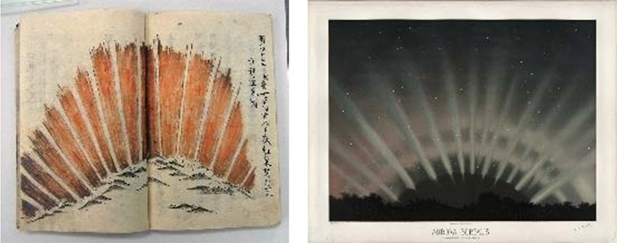 左:1770年9月に京都から見えたオーロラを描いた絵図。松阪市所蔵の古典籍『星解』より。三重県松阪市提供。