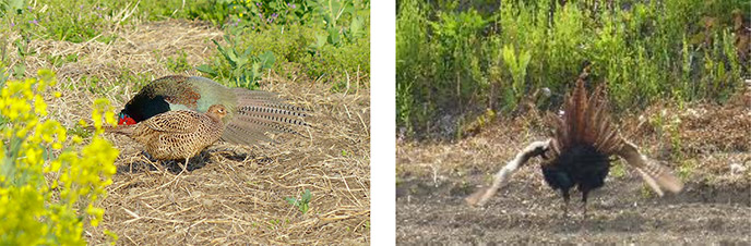 図3: 雉のディスプレイ行動(左)と母衣打ち(右)(撮影: 群馬県 仲川弘道 氏)